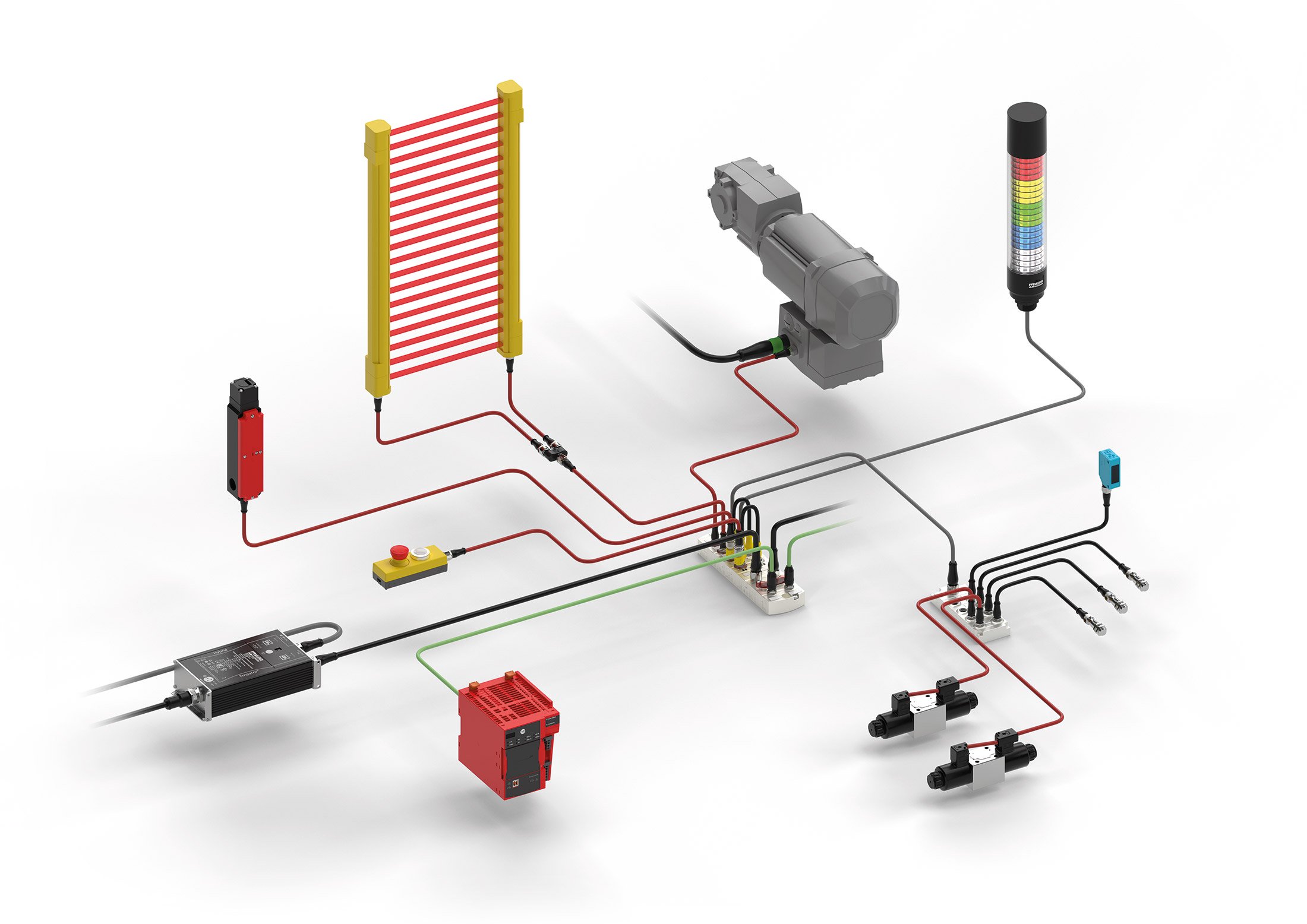 Il funzionamento di molti dispositivi, come il pulsante di emergenza con il ripristino o gli interblocchi di sicurezza, richiede una combinazione di segnali di sicurezza e standard.
